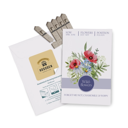 Essentials Seed Packet Envelopes - 95 x 65mm - are beautifully pre-printed, with a choice of wildflower or herb seeds. We can add your logo/branding onto a white square sticker 35 x 35mm, making it a great sustainable promotional product. Each pack icontains x5 seedsticks.Lead time is 5-7 days, for up to 1,000 units