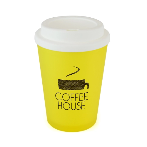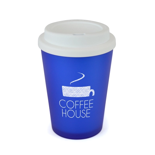 350ml double walled, coloured, PP plastic frosted take out mug with a white plastic screw top lid with sipper. BPA & PVC free